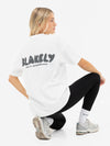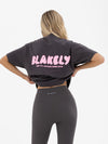 Das übergroße T-Shirt mit Wolkenprint von Blakely in Echtes Marineblau & Puderrosa hat kurze Ärmel und einen Rundhalsausschnitt. Es zeigt unser Branding im Bubble-Stil auf Brust und Rücken.