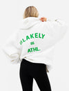 Der schwarze Blakely Hallie Oversized Hoodie verfügt über eine Kängurutasche auf der Vorderseite sowie gerippte Bündchen an Ärmeln und Saum. Er zeigt ein auffälliges, bogenförmiges Logo auf der Rückseite und ein kleineres Logo auf der Vorderseite.