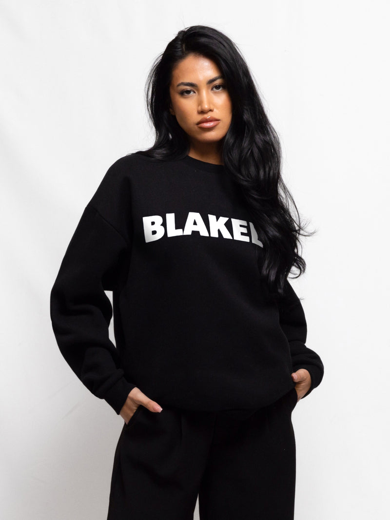 Teil dieser Kollektion ist unser Studio Oversized Pullover in Schwarz. Dieser Pullover ist aus einem weichen Baumwollmischgewebe gefertigt und hat eine übergroße Passform. Er hat gerippte Säume und Bündchen sowie einen Rundhalsausschnitt. Er ist mit unserem neuen Blakely-Branding auf der Vorderseite versehen.